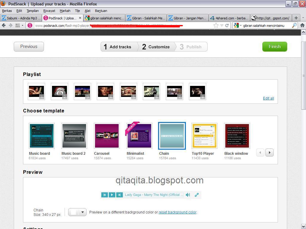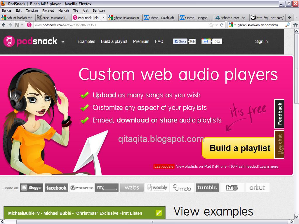 Jika ingin membuat playlist music online anda bisa memanfaatkan PodSnack. Penggunaanya yang sederhana dan membuatnyapun cukup dengan tiga langkah ; memilih jenis pemain atau artis, tambahkan lagu dan menyesuaikan dengan selera. Setelah membuat playlist flash mp3, playlist dapat dibagi (share) kepada teman sebagai promosi album, di pasang pada akun PodSnack atau di download sebagai SWF untuk website HTML Bisa juga PodSnake dikatakan sebagai tuan rumah file audio, dan memungkinkan Anda untuk menambahkan file musik ke situs Anda sendiri atau halaman jejaring sosial seperti Wordpress, blogger, Tumblr, Facebook, MySpace dan lain lain. Untuk tutorialnya ikuti petunjuk yang saya sampaikan ini.