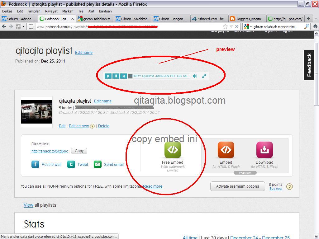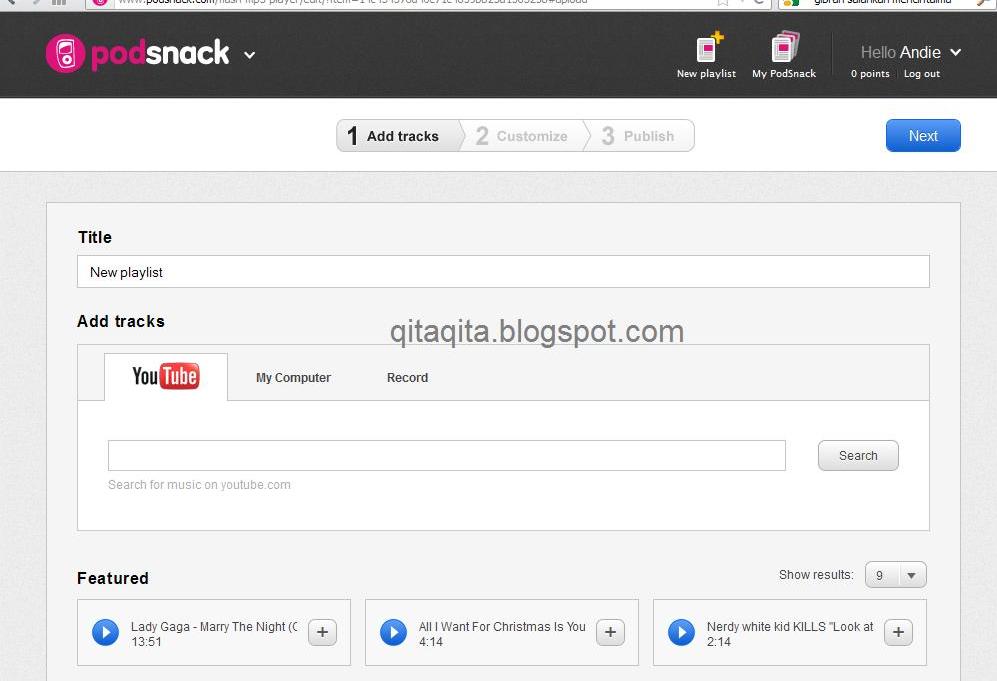 Jika ingin membuat playlist music online anda bisa memanfaatkan PodSnack. Penggunaanya yang sederhana dan membuatnyapun cukup dengan tiga langkah ; memilih jenis pemain atau artis, tambahkan lagu dan menyesuaikan dengan selera. Setelah membuat playlist flash mp3, playlist dapat dibagi (share) kepada teman sebagai promosi album, di pasang pada akun PodSnack atau di download sebagai SWF untuk website HTML Bisa juga PodSnake dikatakan sebagai tuan rumah file audio, dan memungkinkan Anda untuk menambahkan file musik ke situs Anda sendiri atau halaman jejaring sosial seperti Wordpress, blogger, Tumblr, Facebook, MySpace dan lain lain. Untuk tutorialnya ikuti petunjuk yang saya sampaikan ini.